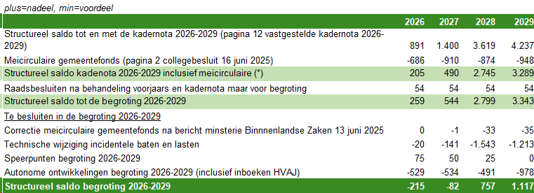 (*) Opgemerkt wordt dat in het collegebesluit van de meicirculaire gemeentefonds (16 juni 2025) het structureel saldo is gepresenteerd inclusief de inboeking van de stelpost Hervormingsagenda Jeugd (HVAJ) van € 829.000 in 2026 en € 877.000 vanaf 2027. Dit was een voorstel bij de kadernota 2026-2029 dat nu in de begroting 2026-2029 gerealiseerd wordt. In vorenstaande tabel is het subtotaal "structureel saldo kadernota 2026-2029 inclusief meicirculaire" dus exclusief de inboeking van de HVAJ. De inboeking van de HVAJ is onderdeel van de "autonome ontwikkelingen begroting 2026-2029".