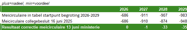 De meicirculaire gemeentefonds is gemeld aan de raad in het collegebesluit van 16 juni 2025 en is betrokken bij de raadsbehandeling van de kadernota 2026-2029. Na de opstelling van dit collegebesluit heeft het ministerie van Binnenlandse Zaken op 13 juni een gecorrigeerde versie van de meicirculaire gemeentefonds gepubliceerd. In 2027, 2028 en 2029 verschoof hierdoor respectievelijk € 1.000, € 33.000 en € 35.000 van eerder geoormerkte middelen naar algemene middelen. Ten opzichte van het collegebesluit van 16 juni jl. ontstaat daardoor het volgende voordeel: