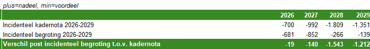 Om deze twee redenen zijn ten opzichte van de kadernota 2026-2029 een aantal posten gecorrigeerd van "incidenteel" naar "structureel". De volgende tabel geeft daarbij het verschil tussen de begroting 2026-2029 en de kadernota 2026-2029 in totaal weer.