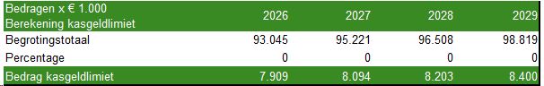 De kasgeldlimiet is het maximale bedrag waarmee een financieringstekort met een kortlopende lening gefinancierd mag worden. In de uitvoeringsregeling Financiering decentrale overheden wordt de kasgeldlimiet voor gemeenten beperkt tot 8,5% van het begrotingstotaal. De kasgeldlimiet bedraagt daarmee € 7,9 miljoen.
